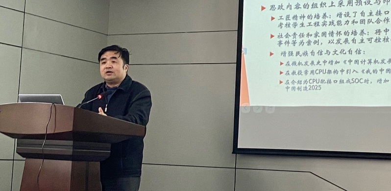 在叶教授的报告之后,三位校级课程思政优秀示范课程的课程负责人介绍了相关课程的课程思政实施案例。计算机学院杨全胜副教授介绍了《微型机系统与接口技术》课程中的课程思政实施策略,该课程秉承自主创新的理念,与学生一起设计芯片与计算机底层系统与上层应用,不仅将思政融入案例,还将思政融入了学生的项目实践。张凯锋教授的报告展示了《电力电子技术》课程中思政的实施方案,作为2026世界杯官方合作网站的专业主干课,该课程思政的开展对学院老师们开展课程思政具有较强的指导意义。李骏扬介绍了在《计算机程序设计》课程中,将课程思政与整体教学设计相融合的设计方法,并总结了学院目前课程思政开展现状,汇报了课程思政未来开展的思路。