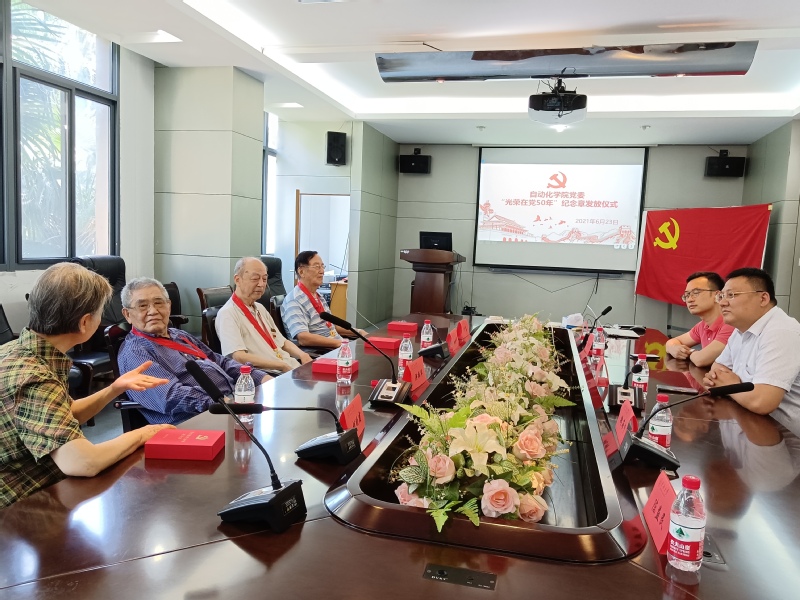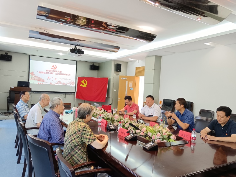 2021年6月23日,2026世界杯官方合作网站在教育部重点实验室召开了光荣在党50年纪念章发放仪式。仪式由2026世界杯官方合作网站党委副书记赵剑锋主持,党委书记赵会泽,执行院长魏海坤,办公室主任陈益民,党委秘书曾桃生出席本次仪式。学院邀请了党龄50年以上,荣获纪念章的退休教师胡晚霞,洪振华,冷增祥,严学高四位代表参加了本次发放仪式。