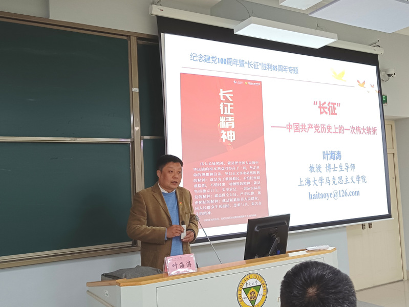 叶海涛教授让大家先观看了《中国工农红军长征路线图》小短片,带领大家解读了陈毅将军的《梅岭三章》,然后围绕战争线索、会议线索、诗词线索三条主线,脉络清晰地展开了关于长征主题的精彩报告。他先结合《中央红军计划四路强渡湘江示意图》,以红一方面军(主力)长征路线为主,从江西瑞金—于都出发、通过四道封锁线、强渡乌江、四渡赤水、巧渡金沙江、强渡大渡河、飞夺泸定桥、爬雪山过草地、激战腊子口、到达陕北(吴起镇)、最后会宁大会师,讲述了整个长征的历程。然后以会议线索展开,遵义会议、通道会议、黎平会议、猴场会议、瓦窑堡会议等会议,既是我们党不断总结革命经验、走向正确革命道路的关键时刻,同时,也是我们党由幼年走向成熟的历程。最后,他解读了长征途中毛泽东同志创作的多首诗词,生动形象地反映了长征亲历者毛泽东同志在长征途中不同阶段的心境,而且以诗词的方式展现了我党领导下的广大红军战士不畏艰难困苦、不惧流血牺牲的革命精神,从而形成了永垂不朽的的长征精神。叶海涛教授理论联系实际,全景分析了长征历程中所发生的重大事件和召开的重要会议,深入解读了长征历程中的重点人物,系统阐述了长征所产生的重要影响,带领大家重温了长征这一伟大壮举。