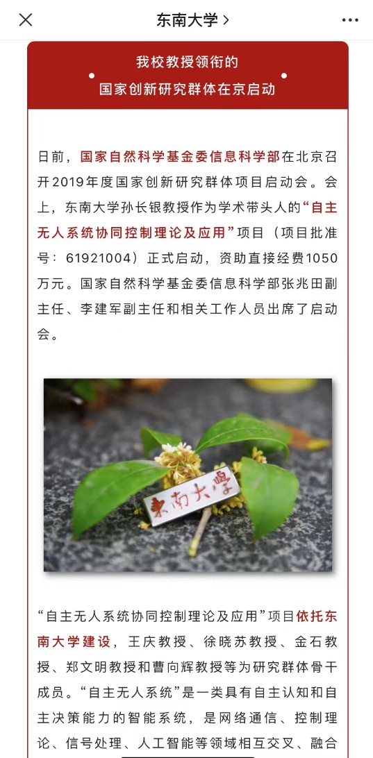 孙长银教授作为学术带头人的项目“自主无人系统协同控制理论及应用”获批国家创新研究群体项目。