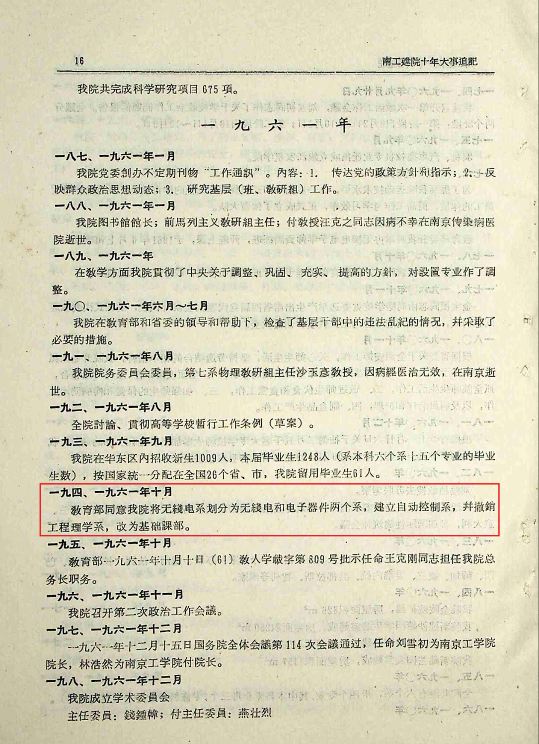 1961年教育部批准南京工学院建立自动控制系档案记录