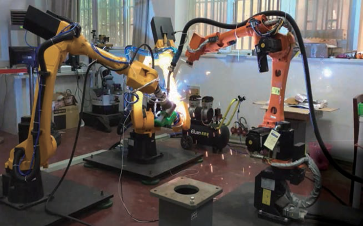 基于自主研发的国产可控工业机器人控制器,实现三机器人协作无夹具焊接系统,突破多机器人协作时的力位协调控制难题、复杂空间轨迹焊缝的机器人协调轨迹规划难题