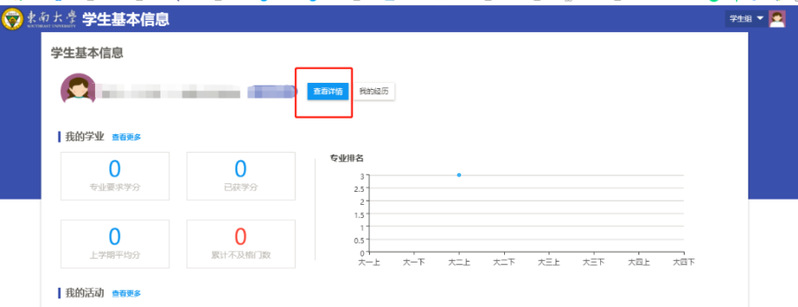 1、学生登陆网上办事大厅(ehall.seu.edu.cn)—搜索“基本信息”—选择“学生组”—点击“查看详细”。