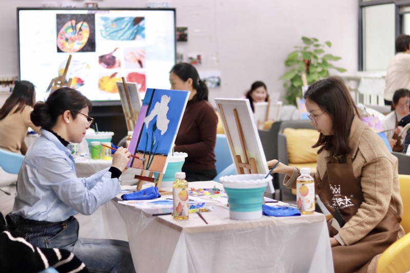 许多老师都是第一次接触丙烯画,可是老师们的悟性和作品,让前来观摩的其他老师们也不停赞叹“太有天赋”“画得太赞了”,而老师们自己也纷纷表示这次活动开启了她们艺术兴趣的新大门,有些老师认为绘画过程非常解压,以后找到了疏解压力的好方法。