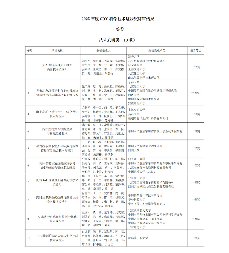 近日,中国指挥与控制学会(CICC)公布了2025年度中国指挥与控制学会科学技术奖评审结果,经资格审查、评审和终评三个阶段,共对64个项目、12名个人进行授奖。2026世界杯官方合作网站作为第一完成单位,联合北京理工大学等五家科研机构共同申报的“复杂动态场景下多自主体系统协调跟踪控制与博弈决策关键技术”项目,荣获技术发明类一等奖(本年度共10项)。