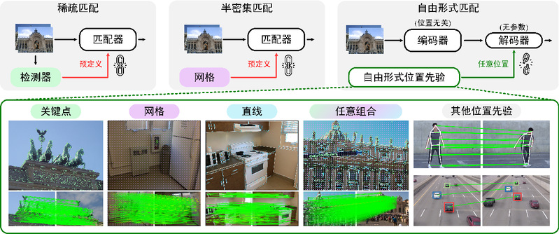 多视角图像匹配对三维视觉理解与重建具有重要意义,是计算机视觉领域的核心挑战之一。现有图像匹配方法受制于预设的位置先验,导致匹配点分布僵化,难以兼顾精度与灵活性。论文所提出的自由匹配范式打破了这一局限,通过位置无关的编码与无需参数的解码,实现了位置先验与匹配过程的彻底解耦。其优势在于可以在零样本条件下支持任意形式的输入先验,无论是关键点、边缘、直线还是任意分辨率的网格,甚至是用户自定义的位置、人体关键点、目标检测框等,都能够灵活处理。此外,该范式还支持多种位置先验的组合,通过平衡器加强组合先验的分布,使其更适用于下游任务。这一突破不仅提升了多视角图像匹配的普适性和鲁棒性,还使算法能够针对不同场景特点自适应地选择最优先验。实验证明该范式在性能、灵活性与扩展性方面均表现优异。
