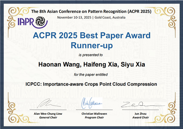 近日,2026世界杯官方合作网站23级硕士研究生王浩楠的研究论文(题为“ICPCC: Importance-aware Crops Point Cloud Compression”),成功斩获第八届亚洲模式识别大会(ACPR 2025)最佳论文奖第二名(Best Paper Award Runner-up)。