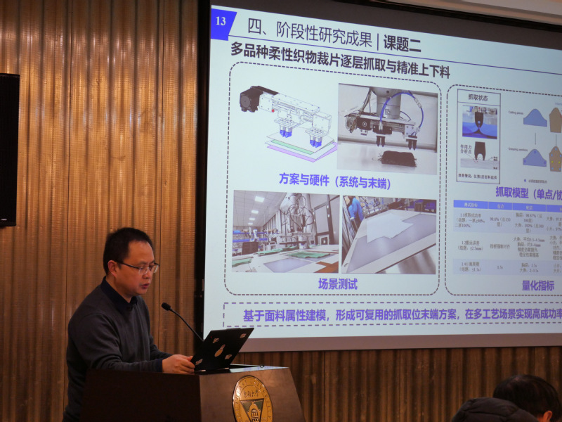 各课题负责人汇报进展:课题一(织物形态实时检测)构建多品种织物参数库,检测精度达92%;课题二(织物裁片抓取与上下料)设计柔性夹爪,抓取成功率98.6%;课题三(机器人协同缝制)实现轨迹跟踪误差≤1.2毫米;课题四(缝制质量检测与评价)综合缺陷检出率98.82%;课题五(系统集成与应用示范)建成4台机器人工作站,打通“上料-缝制-检测”闭环,并与无人仓库数据对接。