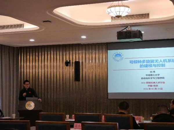 在研讨会的第八场报告中,华南理工大学刘伟教授作了题为“新型无人机系统的建模与控制”的报告。报告以低空经济这一战略性新兴产业为背景,重点介绍了空陆两栖无人机与可倾转旋翼无人机两类系统的结构设计、动力学建模与位姿控制方案,并展望了该领域未来的研究方向与应用场景,为无人机系统的技术创新与工程落地提供了新思路。